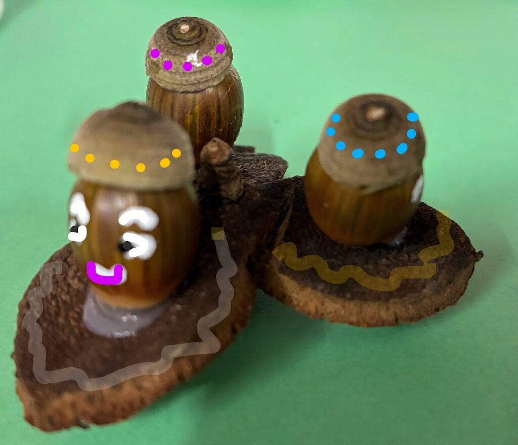 ・どんぐりだけでなく、いろいろな木の実や落ち葉、お芋などを組み合わせて楽しい動物を作りましょう。
