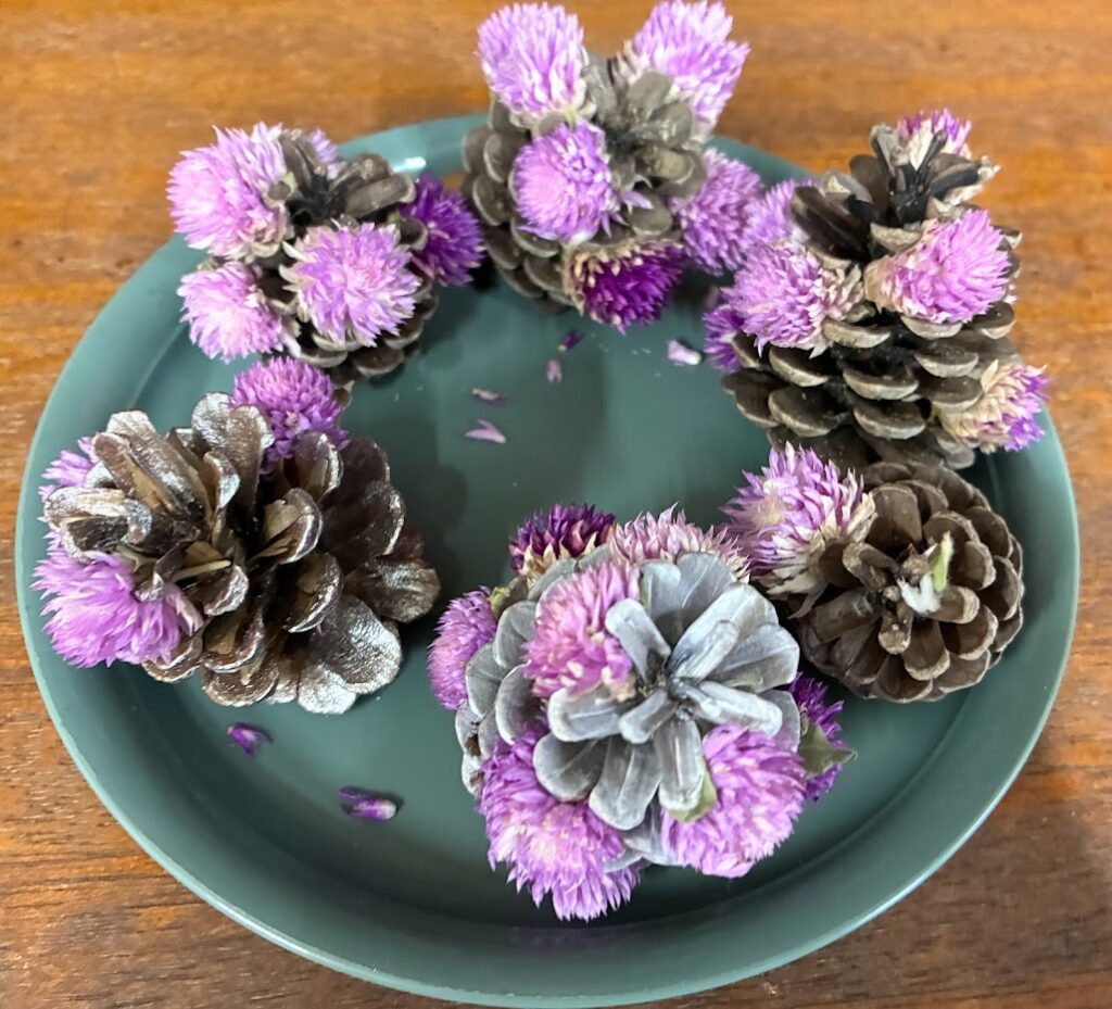 まつぼっくりをきれいに洗って、よく乾かして、千日紅の花を詰めました。