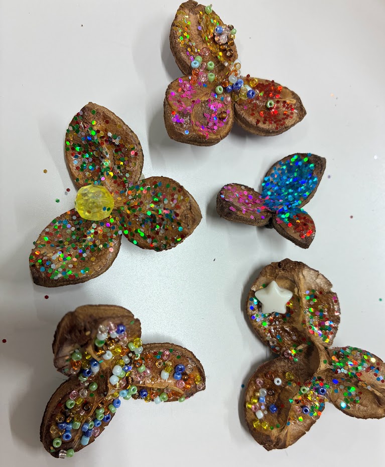 開いた椿の実に、ボンドを薄く延ばして、その上にラメやピーズを振りかけました。