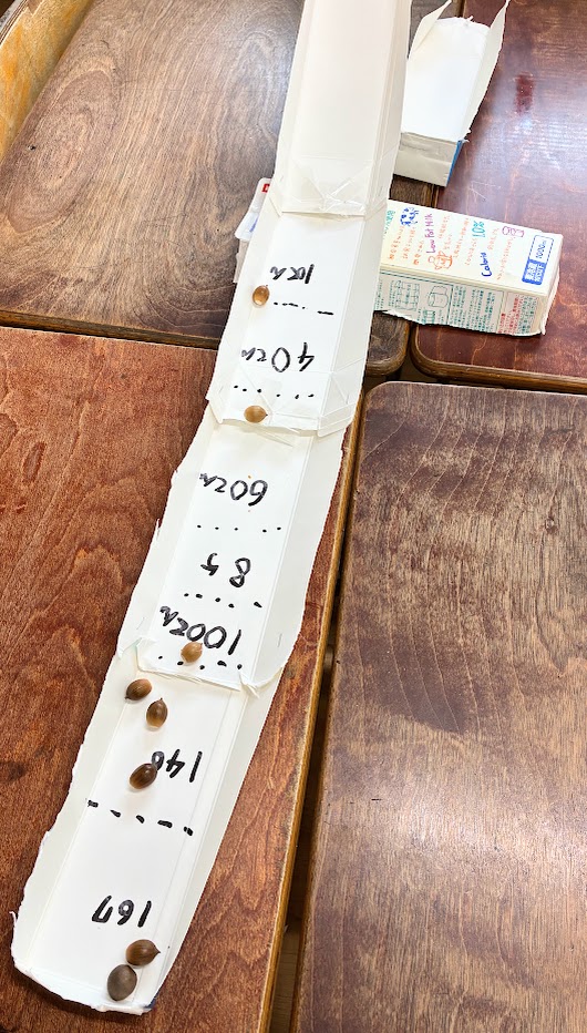牛乳パックを半分に切って、長くつなげました。