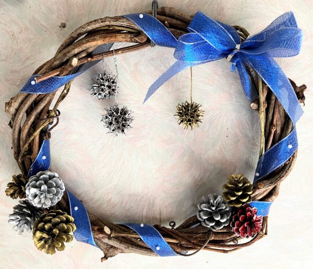 庭の木の実、いぶきの葉、柊の葉、そして金のまつぼっくりなどで飾り付けたら、とっても素敵なリースの出来上がりです。