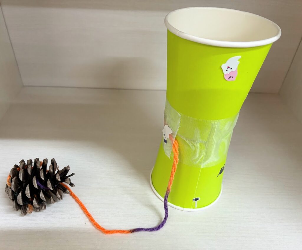 まつぼっくりに毛糸を絡めて、紙コップに取り付けるとできあがりです。