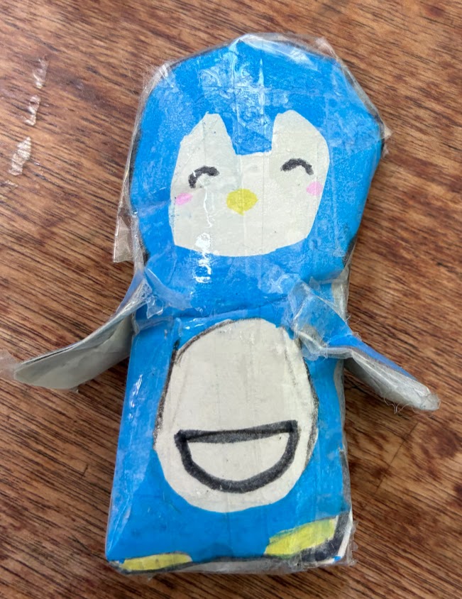 下のペンギンシールは、紙にペンギンの絵を描いて薄く手芸用の綿を挟みふくらみをつけました。ドロップシールのつもりです。