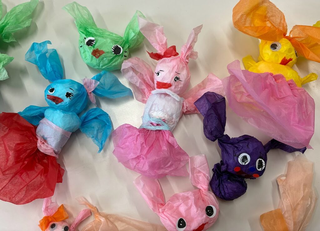 カラフルな花紙を使って、お友達をたくさん作りました。